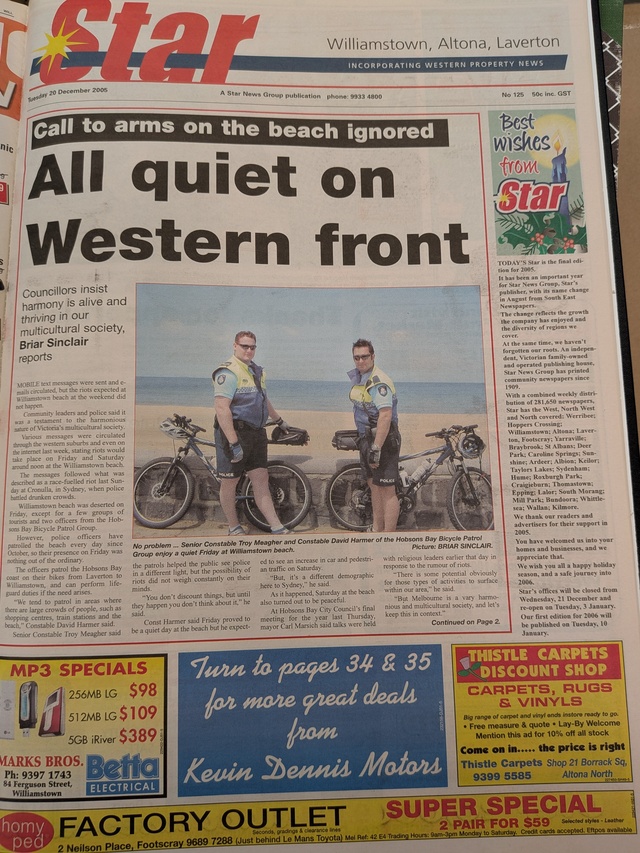 Mobile text messages were sent and emails circulated, but the riots expected at Williamstown beach at the weekend did not happen.