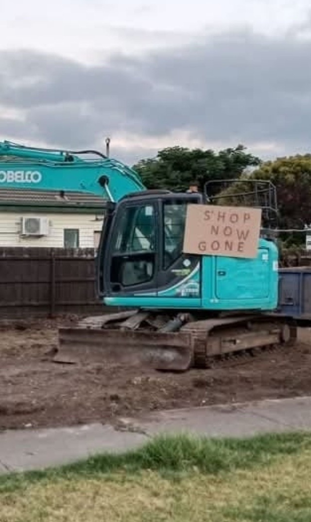 Where the corner store once stood is now just an empty block with an excavator sitting in the middle and a cardboard sign attached to the cab.