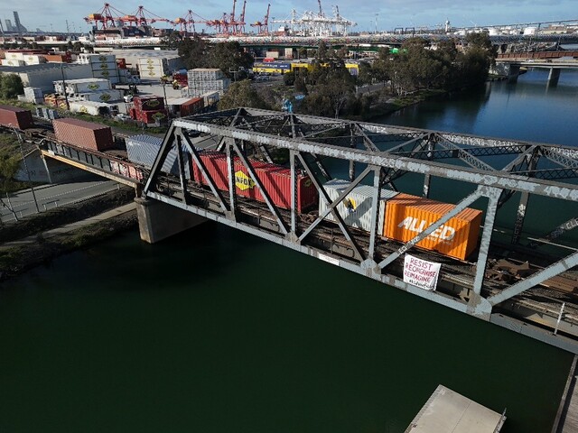 Protesters from the activist group had earlier halted the train as it crossed the rail bridge about 7.30am, with Mia believed to have then climbed aboard one of its containers from Maribyrnong Street.