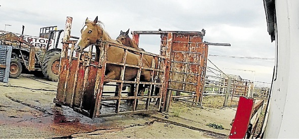 ■ A sick horse being shot in front of more than 20 other horses in a paddock then being dragged about 60 metres across gravel and concrete while apparently still alive, and again being shot before its throat is cut.